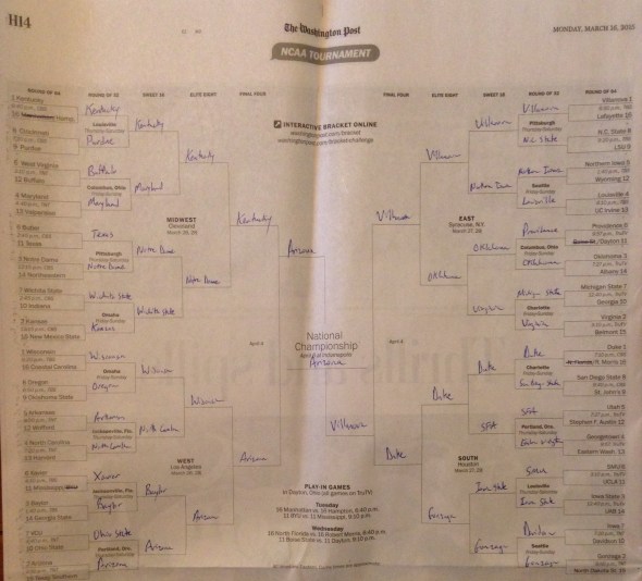 Here’s my bracket for this year. I’m not entering any contests. I think Kentucky will win, but I’ll go with Arizona with the upset and then to win it all. (Based on my past picking experience this means Kentucky will beat Duke for the championship.)
